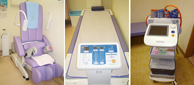 腰椎けん引治療器、頸椎けん引治療器、ウォーターベッド型マッサージ治療器、経鼻内視鏡、ウォーターベッド型マッサージ治療器、X線撮影装置、 腹部エコー装置、動脈硬化をしらべる機械、心電図など、当院では様々な医療機器を備えています。